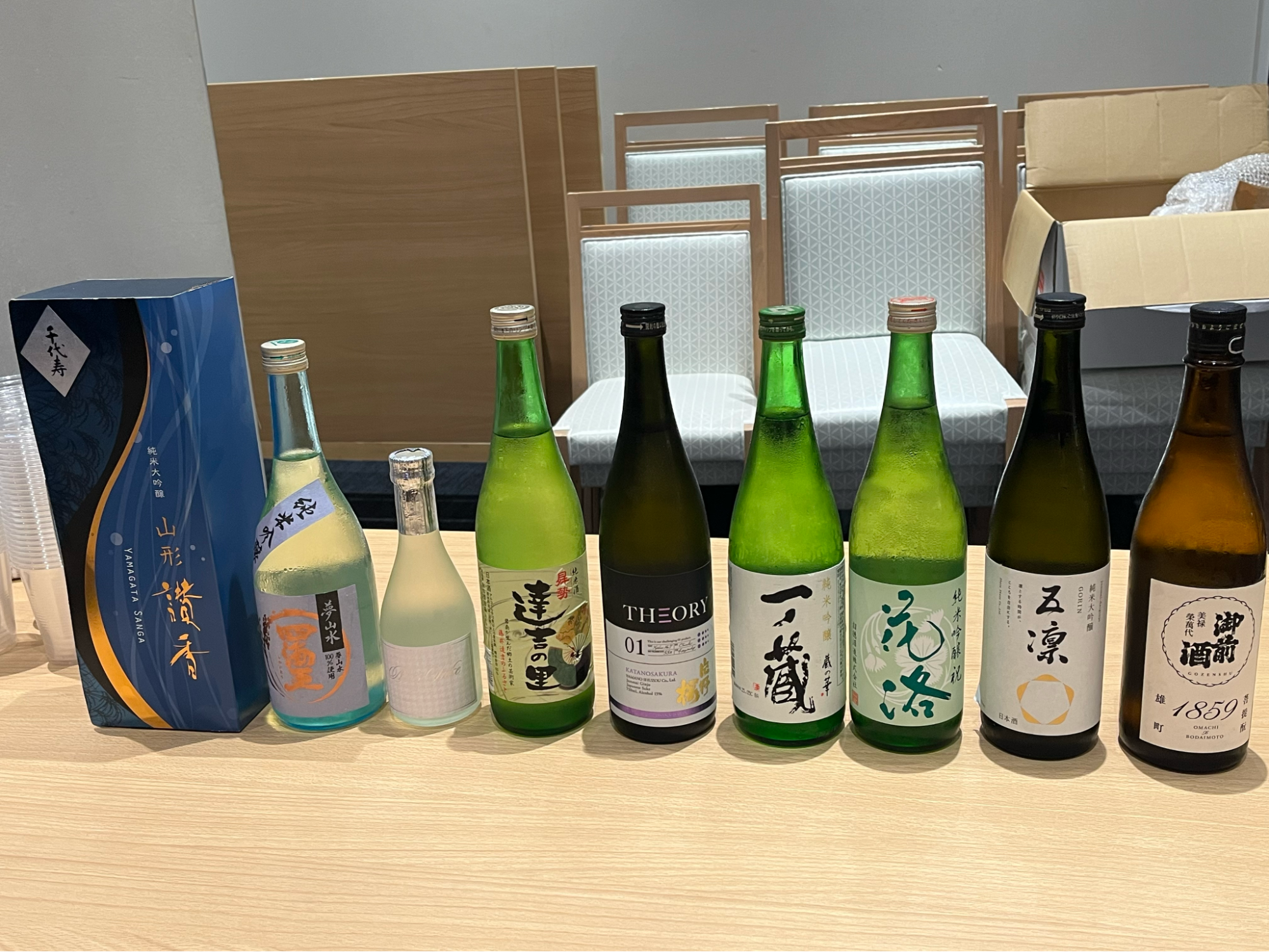 お話を伺った後には、懇親会も行われ私たちMiss SAKEはご覧の9種類の日本酒を振る舞いました。