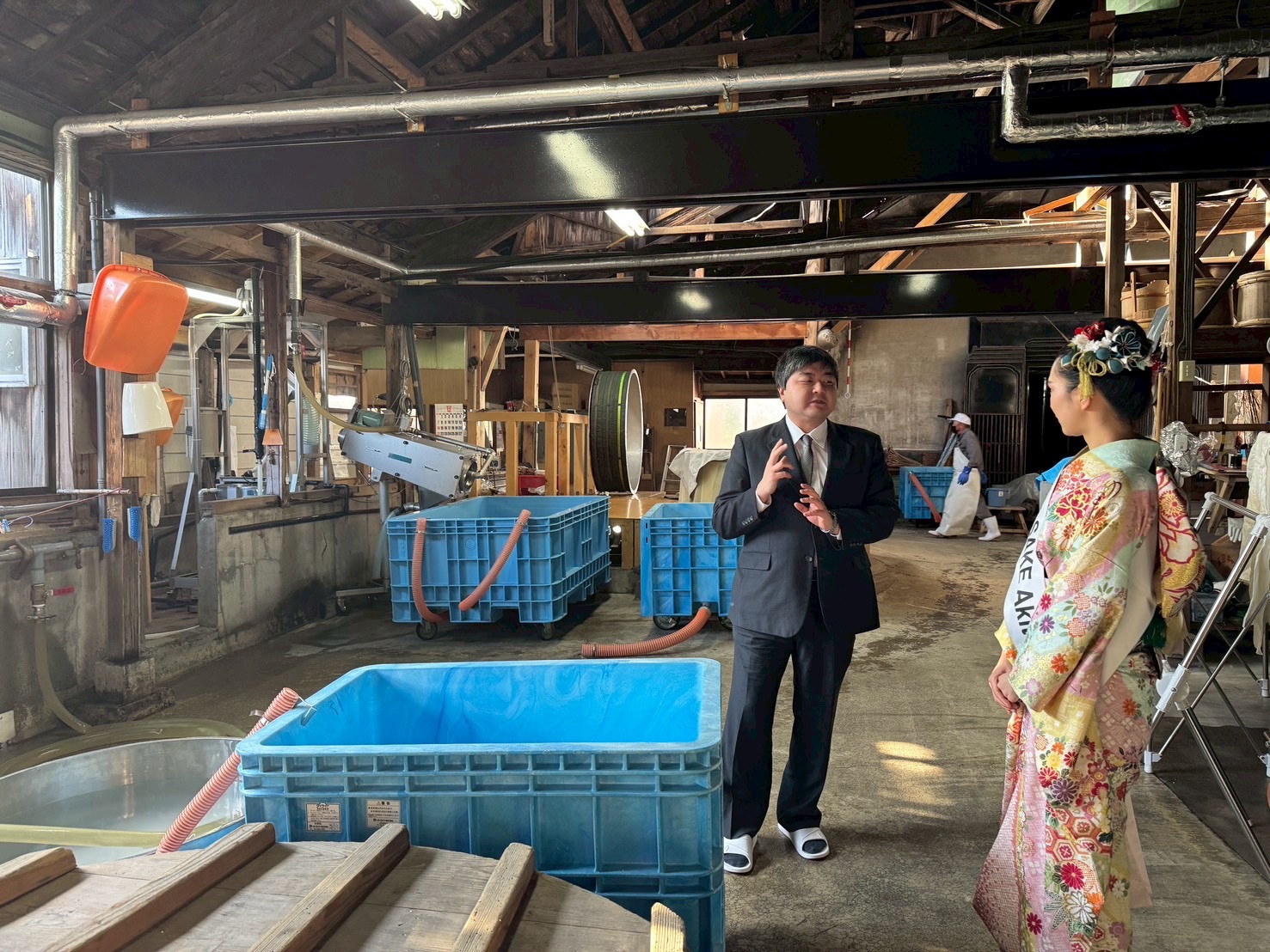 I am pleased to report that, on Wednesday, December 10, I had the honor of paying a courtesy visit to Akita Shuzo Co., Ltd., accompanied by our organization’s Representative Director, Ms. Mika Onishi. During the visit, we were graciously guided through the brewery by President Mr. Sho Nomoto, who personally provided detailed explanations.