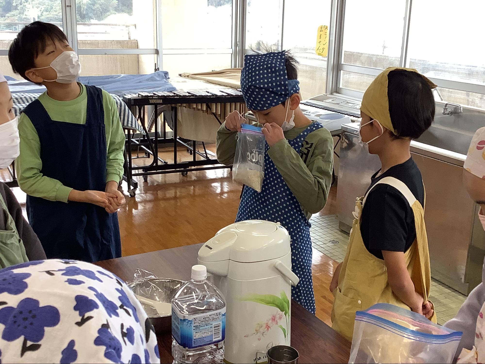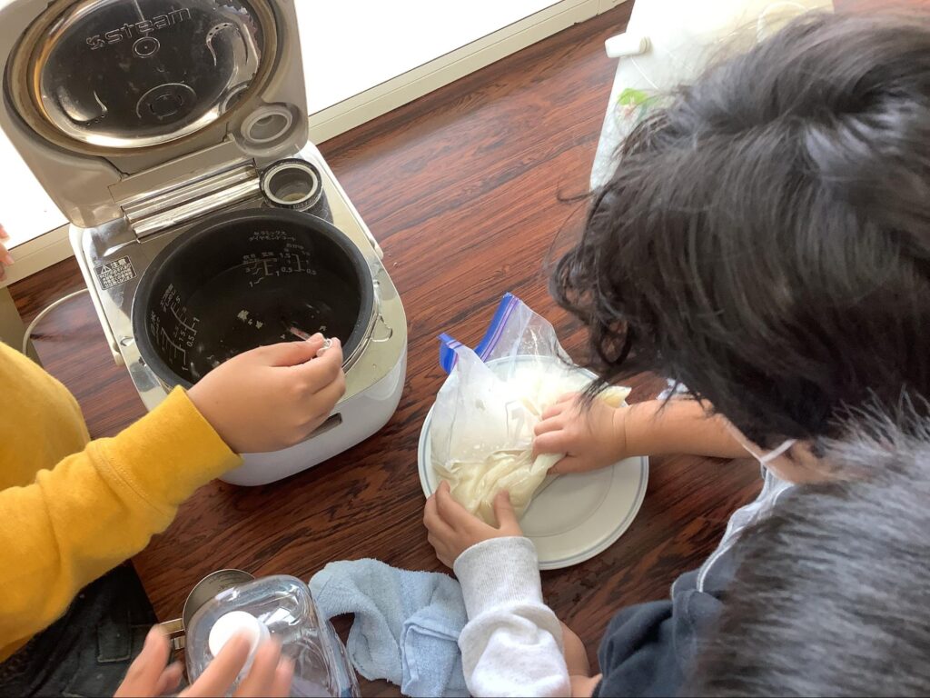 子どもたちが麹の香りを嗅いでみると、「ひなあられみたい!」「ポップコーンみたい!」と、口々に何かに例えて表現しておりました。