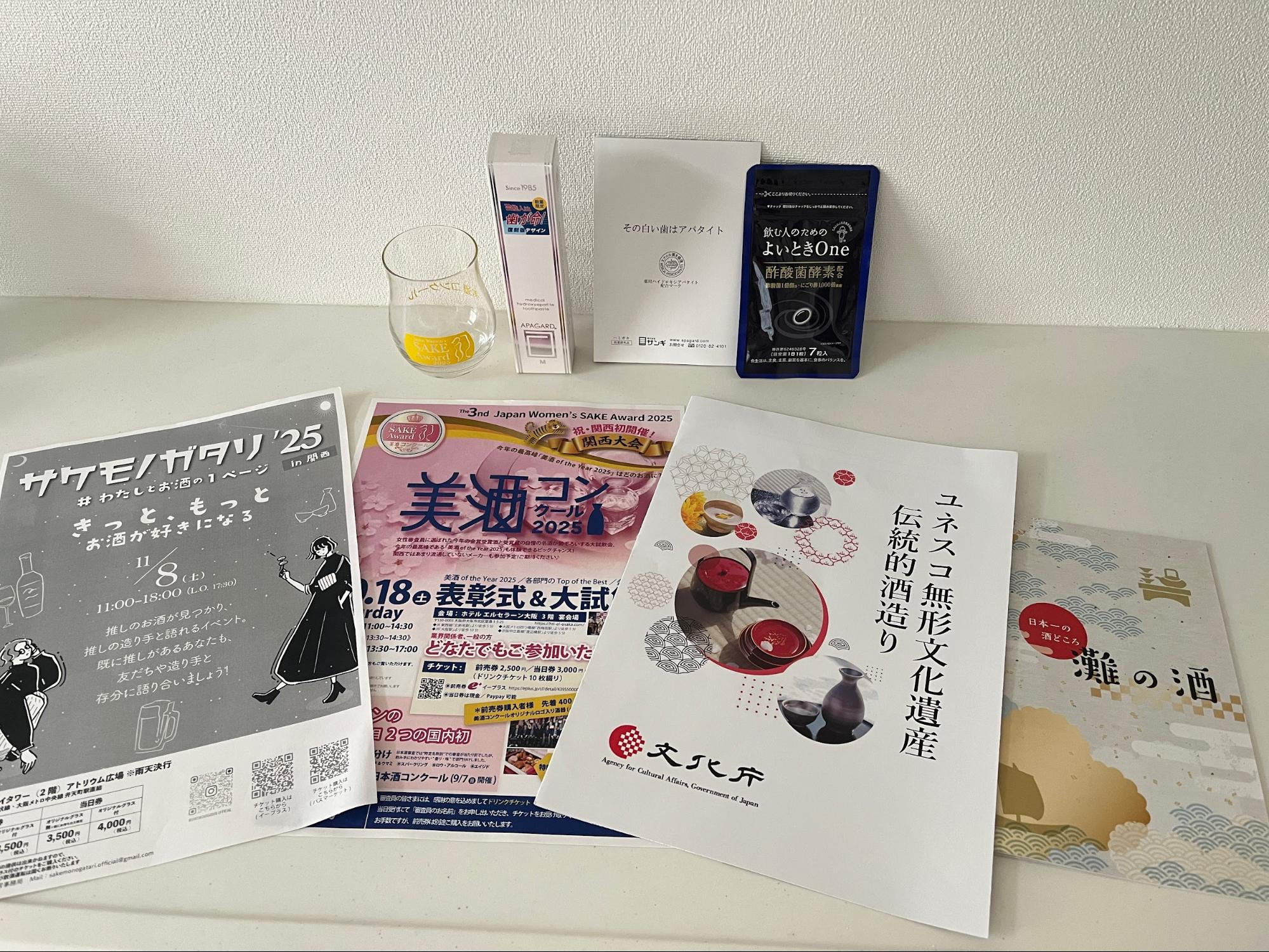 また、審査会終了後には、審査員の皆さまに対し、美酒コンクールの記念オリジナルグラスや、灘五郷の魅力を伝えるパンフレット、さらには関西地域で開催予定の日本酒イベントに関するチラシなどが配布されました。こうした資料は、日本酒の世界をより深く知るための貴重な学びのきっかけとなり、私自身とてもありがたく拝見いたしました。