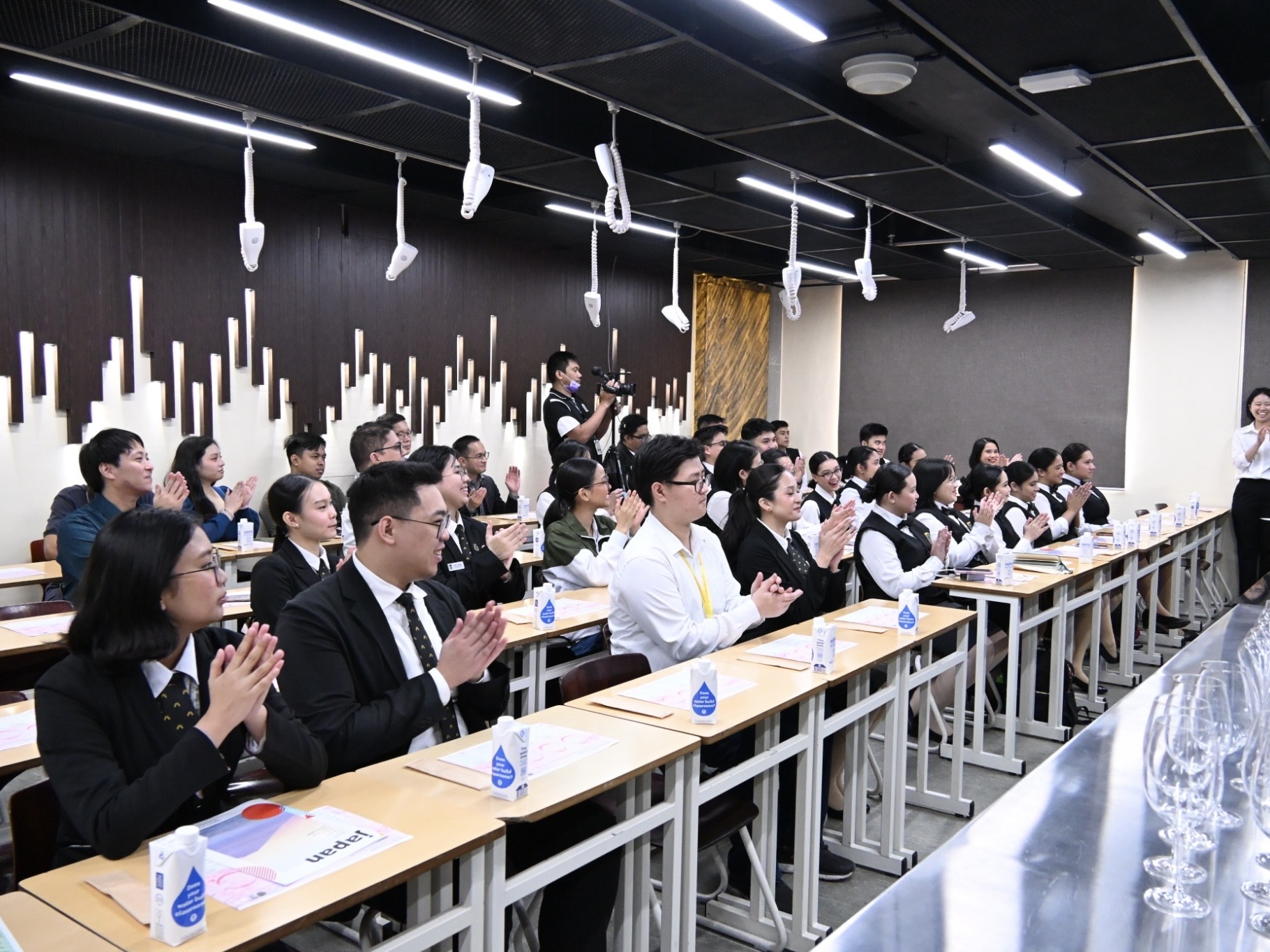 講義開催日は「Contest Week」と呼ばれる期間だったそうで、別室ではカクテルレシピの開発や客室乗務員の機内サービス、調理技術などを競うさまざまなコンテストが開催されていました。これらのコンテストは、企画立案から審査員の選出・依頼、当日の運営に至るまで、すべて学生主体で行われているとのことでした。お祭りのような活気ある雰囲気の中、明るく朗らかな学生の皆さんに迎えられ、私たちの日本酒講座も開講されました。今回の講義は「Master Class」として実施され、対面では選抜された約50名の学生が参加したほか、別室での同時中継を通じて、多くの学生の皆さんに日本酒や甘酒について学んでいただきました。