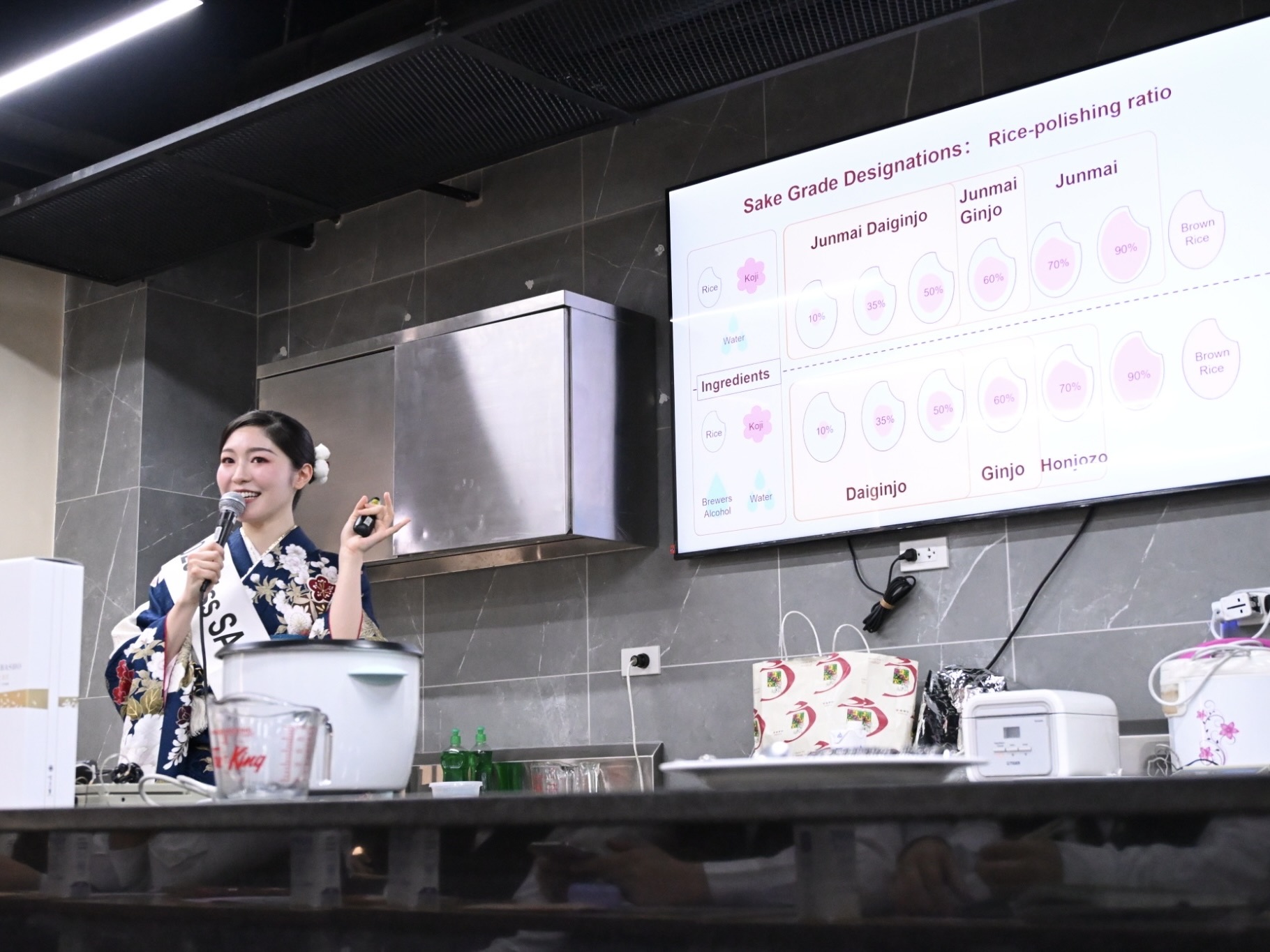 その後は、甘酒の手作り体験ワークショップを開催させていただきました。「日本酒」については事前に知っていると答えてくれた学生も多く見られましたが、「甘酒」に関しては、今回初めて耳にするという方がほとんどでした。日本酒は海外でも徐々に認知が広がりつつありますが、その製造過程や麹文化から生まれる甘酒については、まだ十分に知られていないことを改めて実感しました。そこで今回は、甘酒が高い栄養価を持つこと、またノンアルコールで子どもから大人まで楽しめる日本の伝統的な発酵飲料であることをご紹介した上で、炊飯器を用いた作り方を解説し、ボランティアの学生とともに実演しました。