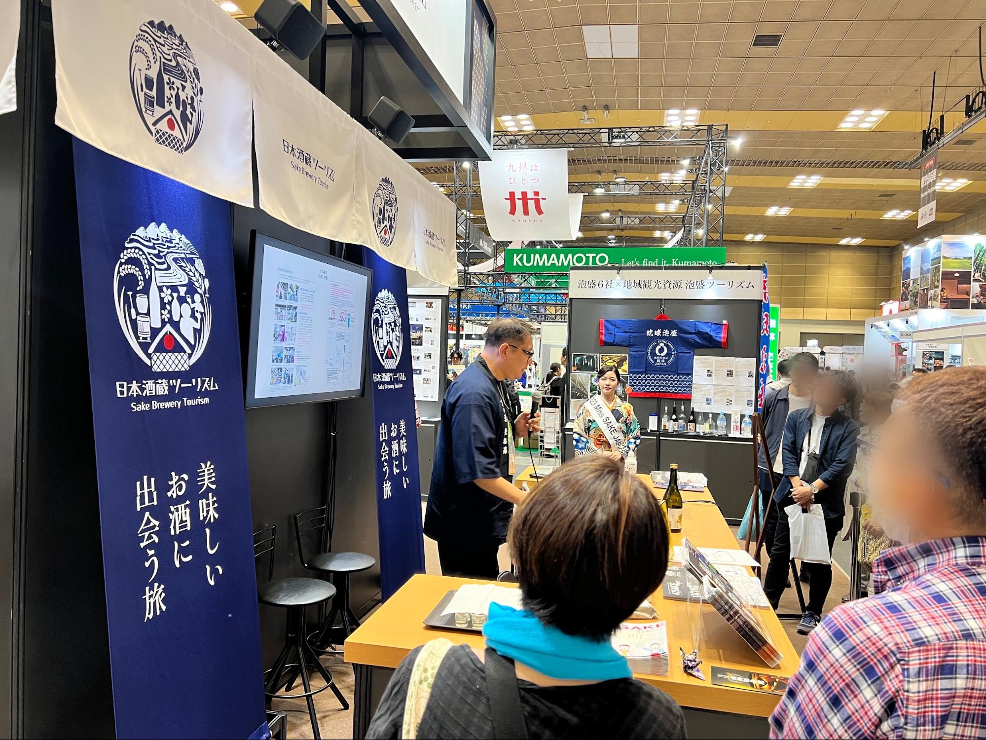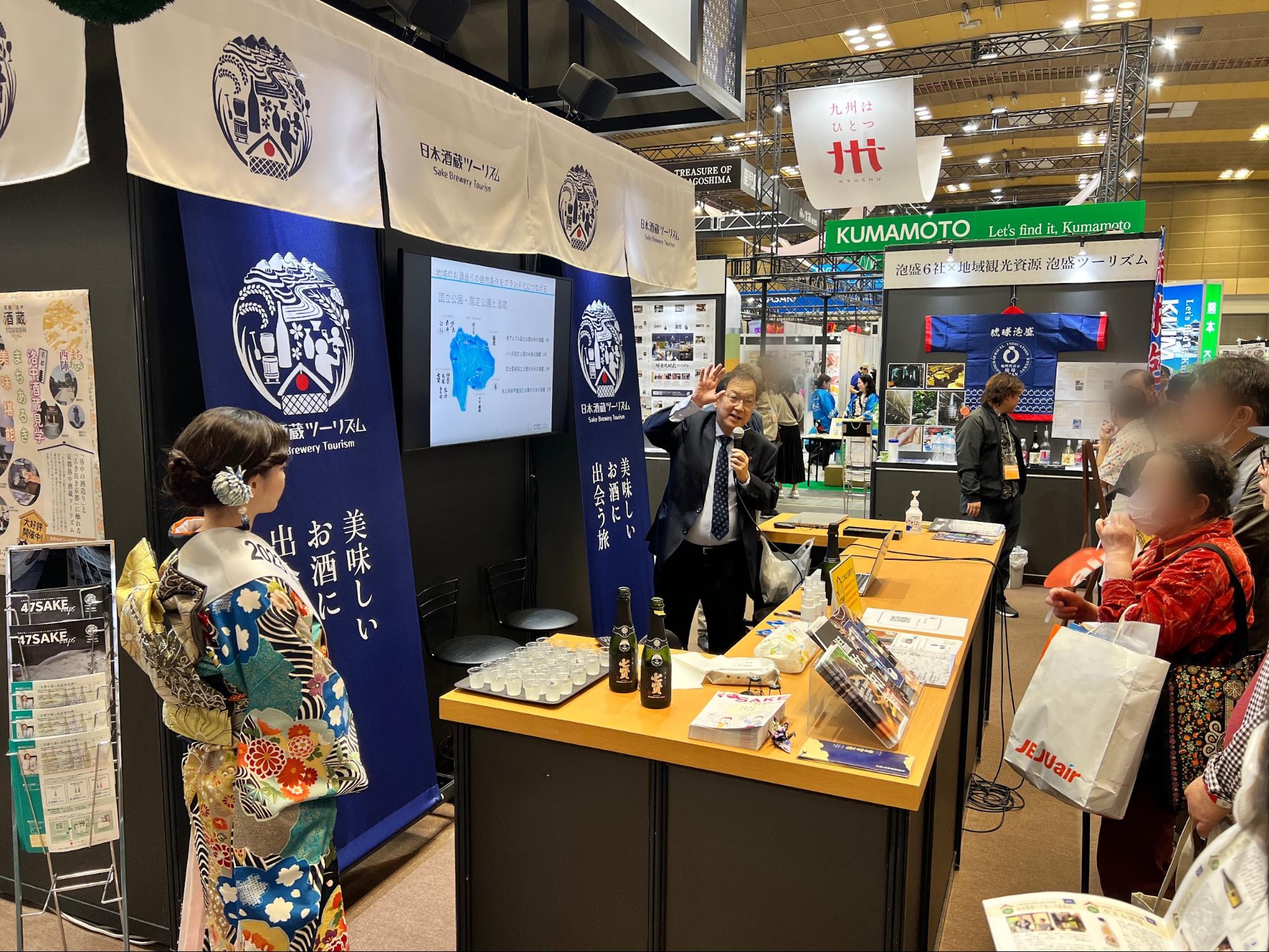今回ブースでは、各地域の地酒を主とした酒蔵ツーリズムのご紹介のほか、特定の地域の商品・農産物の評価や品質を保護する「GI(地理的表示)」制度が紹介されました。より多くの方に地酒やその土地に親しんでいただけるよう、地酒の試飲付きのプレゼンテーションも行われ、私たちもそのお手伝いをさせていただきました。