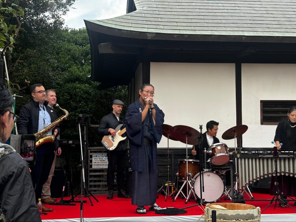 また、ステージでは、サックス・ベース・ビブラフォン・キーボード・ドラムによるバンド演奏、そしてナデシコプログラムの日本舞踊講義でお世話になった藤間美都也様率いる三味線のステージなど、計4回の生ライブが行われました。