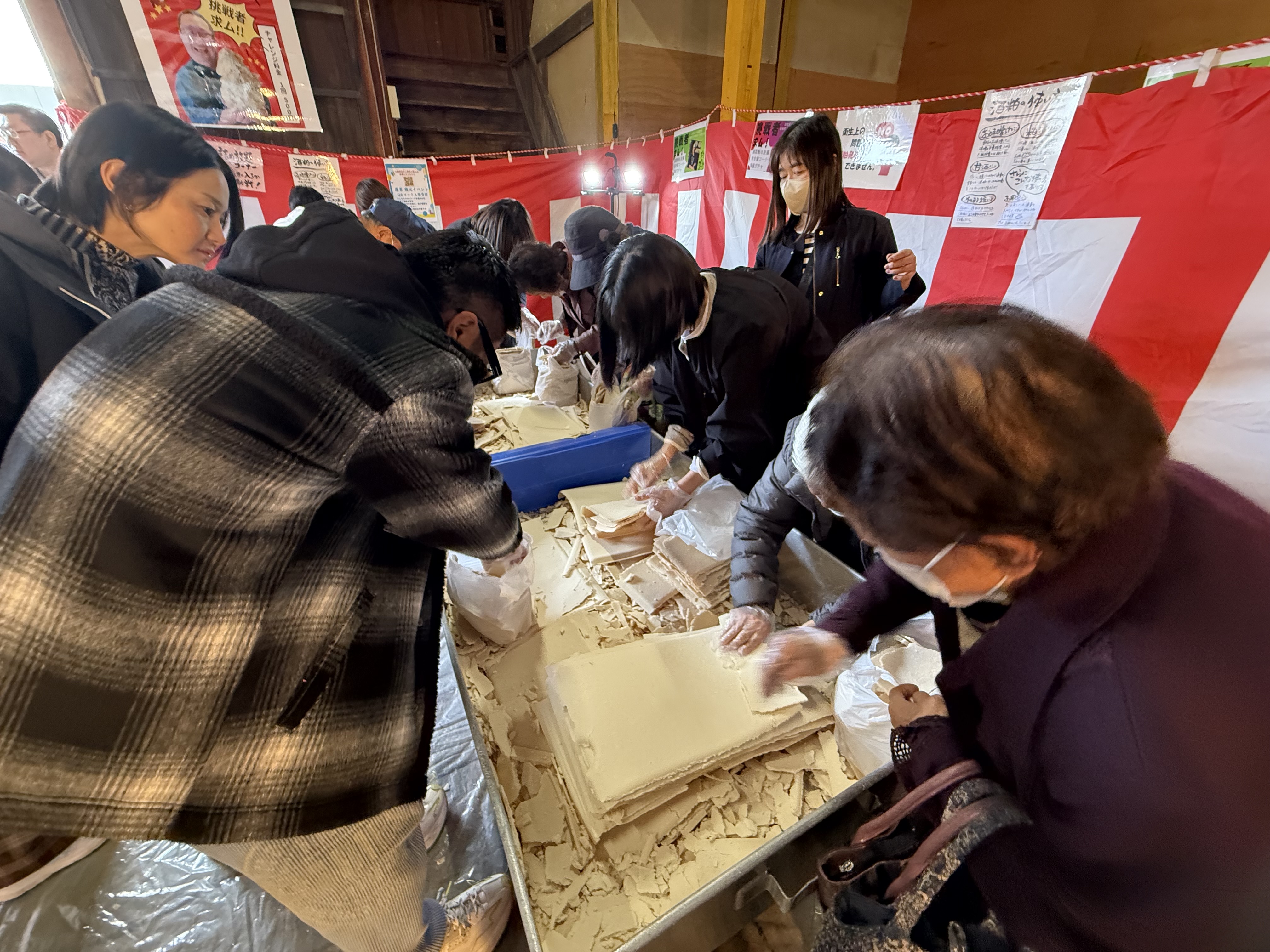 中でもひときわ人だかりができていたのが、酒粕詰め放題コーナーです。訪れた方々が手際よく袋いっぱいに酒粕を詰める様子は、この蔵まつりならではの光景でした。お話を伺った所、酒粕を甘酒や酒粕風呂、酒粕パックに使うという声のほか、焼いてせんべいのようにして味わうなど、それぞれの楽しみ方がある点が印象的でした。私からは酒粕チーズ鍋をご紹介しました。皆様から「美味しそう」や「ぜひ試してみたい」といった声をいただき、会話が弾む場面もありました。