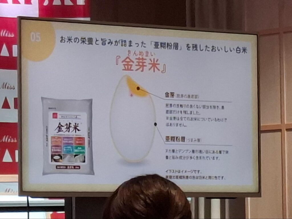 実際に金芽米のお弁当をお昼にいただきましたが、ツヤツヤでふっくらしたお米に更なる感動を得ました。ファイナリストの中のお米キャラとして、金芽米はじめ様々なお米についての知識も得たいと感じる講義でした。