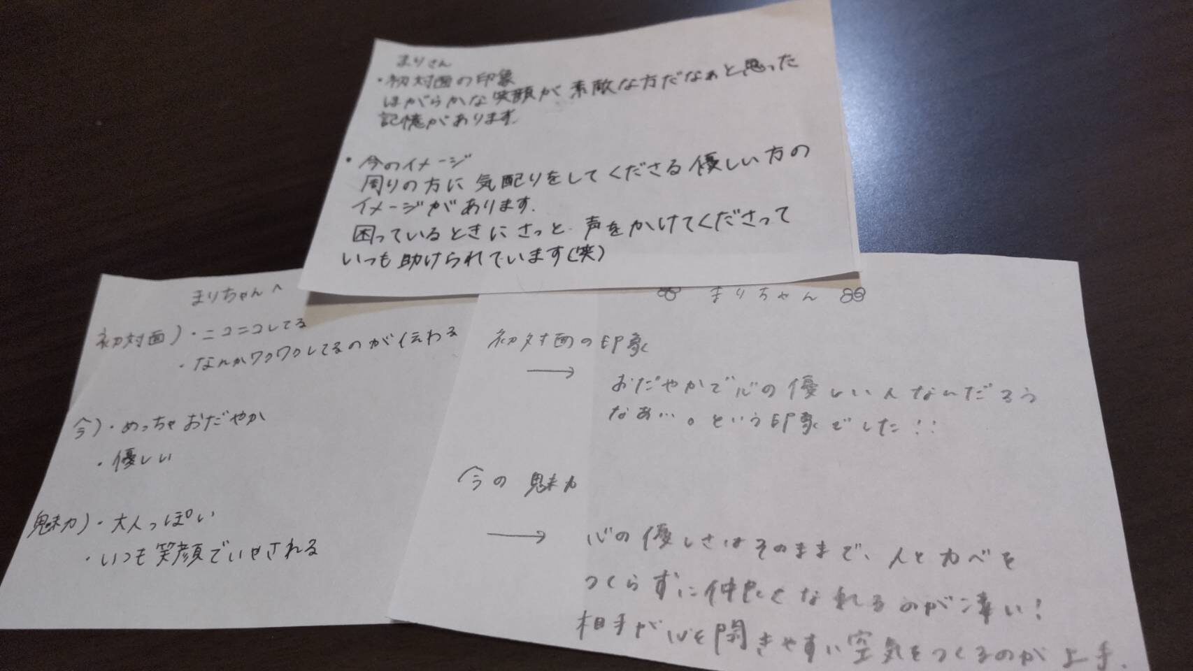 と共同でお互いの初対面の印象・今思っている印象を紙に書き出し、渡し合いました。