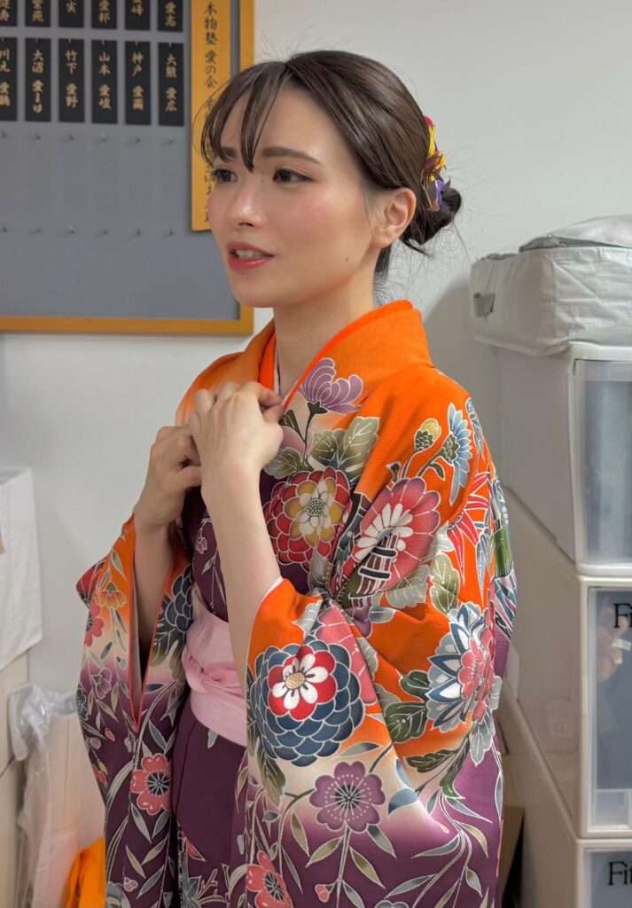 二つ目は、半衿と重ね衿の扱いです。訪問着ではあまり意識してこなかったため、振袖ならではの華やかな表現に難しさを感じました。半襟を美しく見せること、重ね衿と振袖の襟を整えることを意識して練習しました。