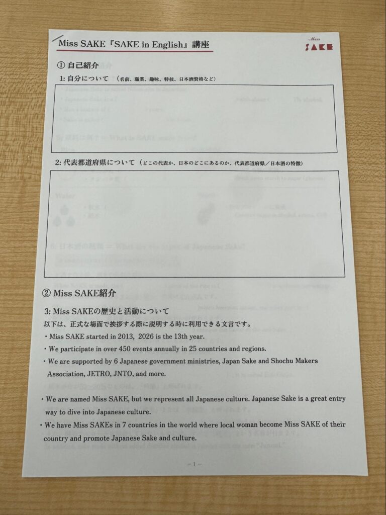 続いて、Miss SAKEの歴史や活動についての英語表現を学びました。Miss SAKEの歴史や活動に関しては、言語の種類を問わず、きちんと説明できるようにしておくことが重要だと思いました。