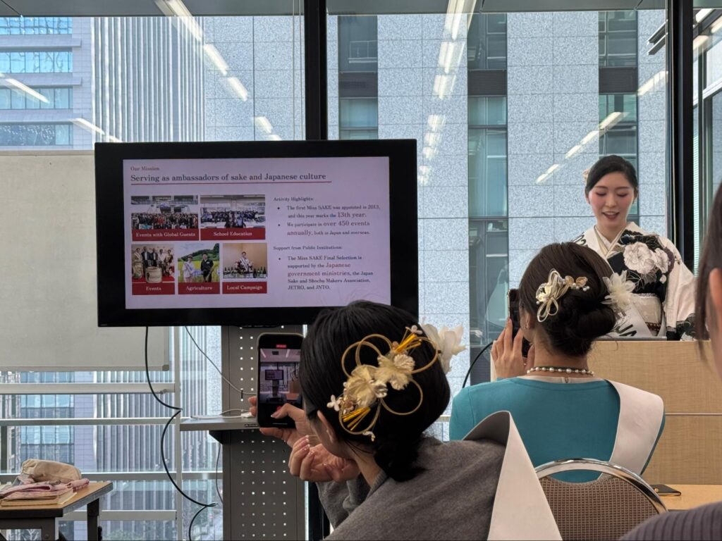 In the morning, I attended a lecture on positioning sake as a “global drink” through UNESCO Intangible Cultural Heritage recognition. As sake consumption and the number of breweries continue to decline, efforts are being made to restore its cultural significance. By promoting sake as part of Japanese culture rather than just an alcoholic beverage, it is expected to regain attention both domestically and internationally. Expanding the fan base is key, and strategies such as collaborations with anime and games, innovative labeling, and pairing sake with a wider variety of foods were introduced. I was particularly inspired by the idea of “soft power,” and I hope to help enhance the global appeal of sake through cultural influence as a Miss SAKE.