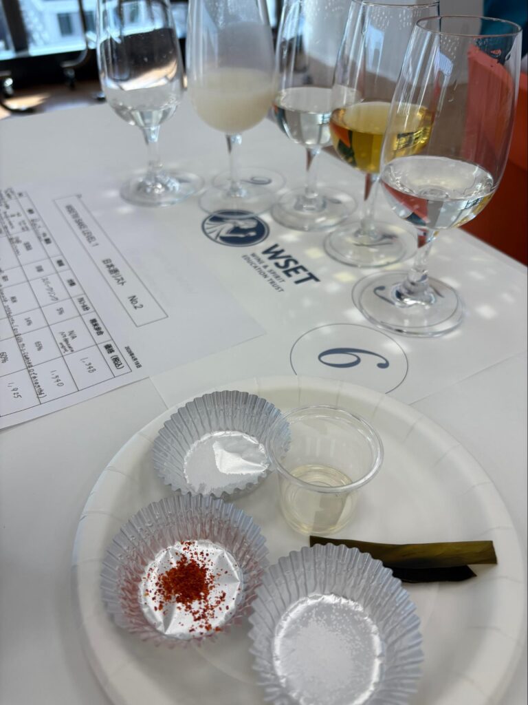 WSETの日本酒資格はLevel1(日本語/英語)とLevel 3(英語のみ)があり、グランプリになるとLevel 3まで学べるということでとても興味があります。この日以前は、Miss SAKEとして人前に立つことに不安がありました。それは日本酒をただ個人的に美味しくいただく だけではなく、その魅力を正しく伝える責任があると思っていたからです。大変意義のある活動であるとともに技術に不安があったため、代表に選出いただいてからのこの2ヶ月間はYouTubeで日本酒に関する動画を聞き流してきました。その甲斐もあって講義の内容も深く理解でき、実りのある1日となりました。座学(日本酒について/製造工程/区分と分類/風味に影響を与える要素/日本酒の管理とサービス方法)について、「簡単な一言で伝える」と混乱を避けられて効果的に日本酒の魅力をお伝えできると心得ました。先生もおっしゃっていたようにお伝えする際は簡単な一言、伝える側の知識は常に深める重要性も理解しました。濁り酒の開栓の仕方(栓を開けてCO2を出してから おりを振る)も大事なポイントです。溢れている光景を見たことがあります。以下ではテイスティングについてシェアさせていただきます。