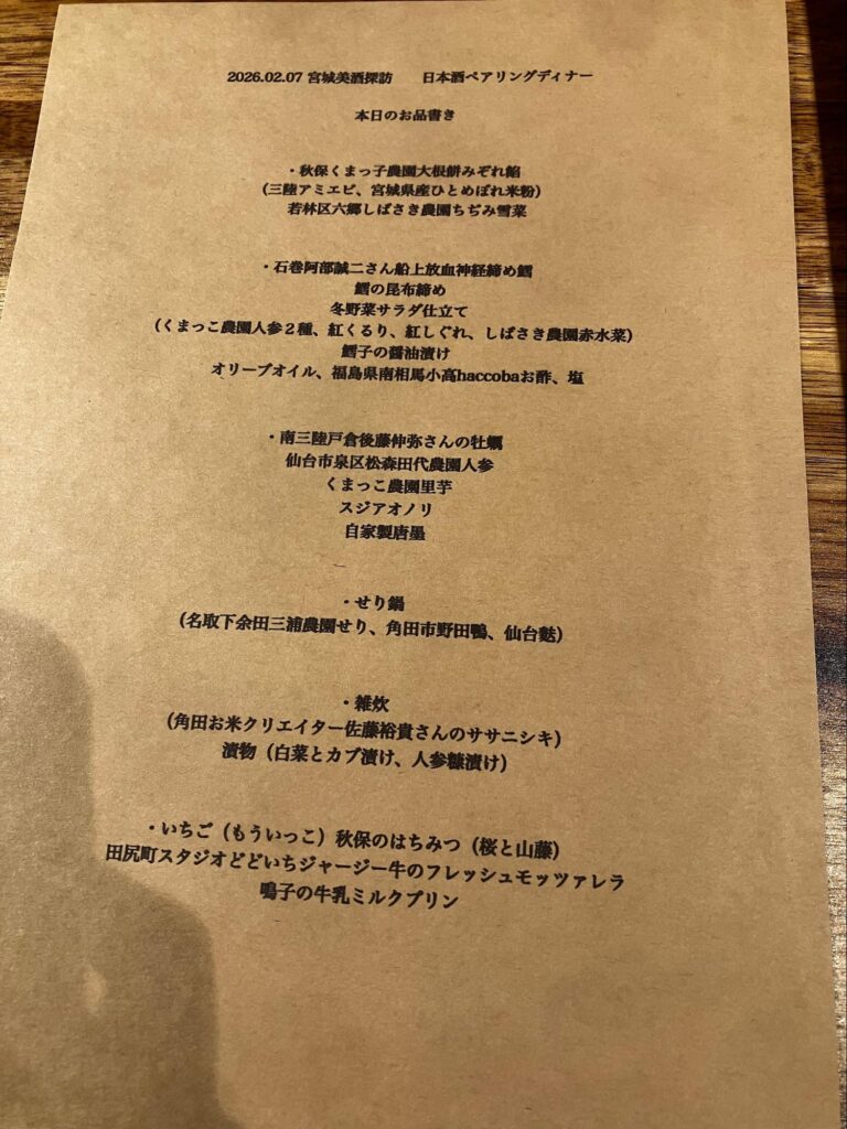 夕食はこうめにて、宮城の食材を使った郷土料理に宮城県の日本酒を合わせ、ペアリングを楽しみました。