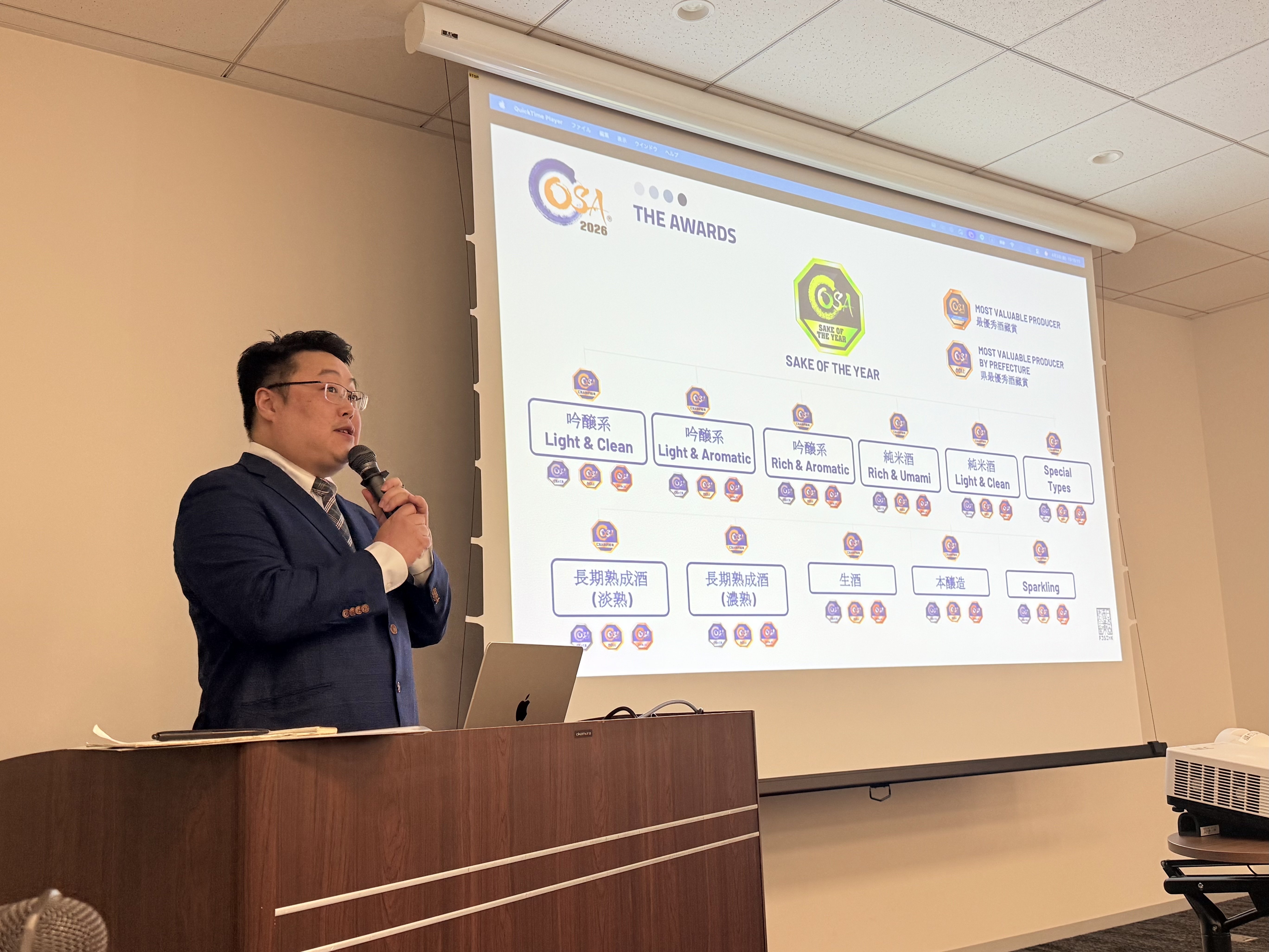 The event began with a lecture by OSA founder Mr. Mickey Chan, titled “Introduction to the Hong Kong Sake Industry Association and OSA” (with interpretation by Ms. Enomoto of Sake Industry News). He opened with words of appreciation to participating breweries and media representatives. He then introduced one of OSA’s defining features: eleven entry categories classified not by traditional sake designations, but by aroma and flavor profiles.