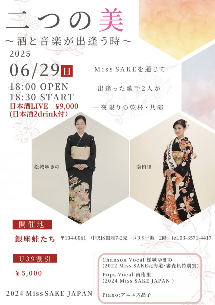 このたび、Miss SAKEのご縁で出会った2022 Miss SAKE 北海道 審査員特別賞であり、シャンソン歌手の 松城ゆきのさんと共に、2025年6月29日日本酒LIVEを開催する運びとなりました。