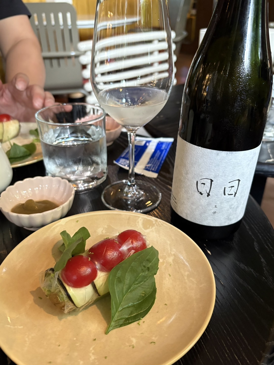 ソースは、焼きナスと日本のお酢と醤油を混ぜ合わせたものを使用しており、野菜の生春巻きにディップしながらいただくことで、日日 玉栄(日々醸造)の味わいが口の中に広がり、まるでディップしたソースのように溶け込む。