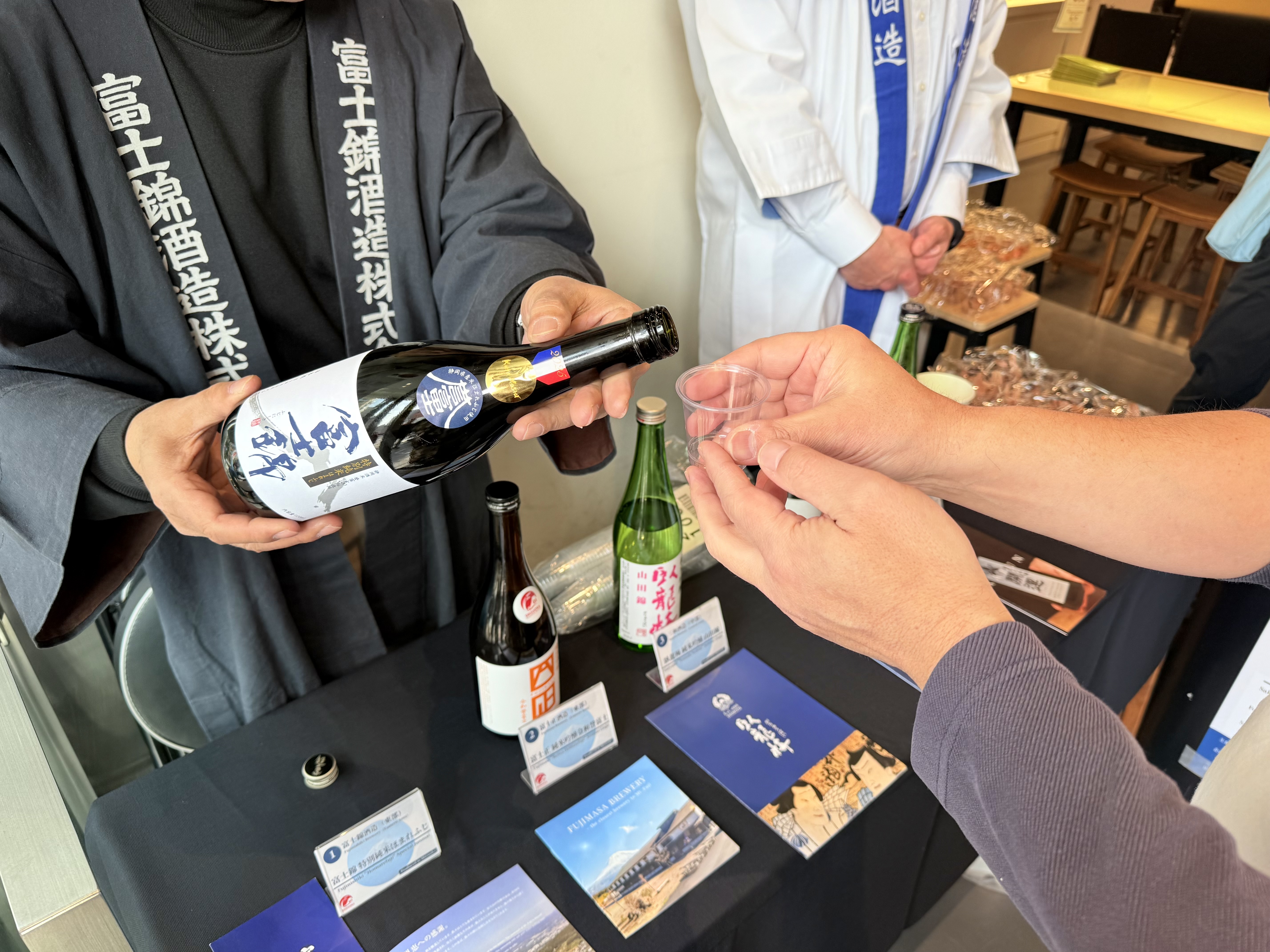 当日は、富士錦酒造、富士正酒造 の蔵元の方々にもお越しいただき、県内各地域から選りすぐった5銘柄をご提供。東部・中部・西部それぞれの個性を飲み比べながら、蔵人ご本人の解説やおすすめに耳を傾けることで、同じ「GI静岡」であっても地域や酒蔵ごとに異なる表情があることを、多くの来場者の皆さまに体感していただきました。