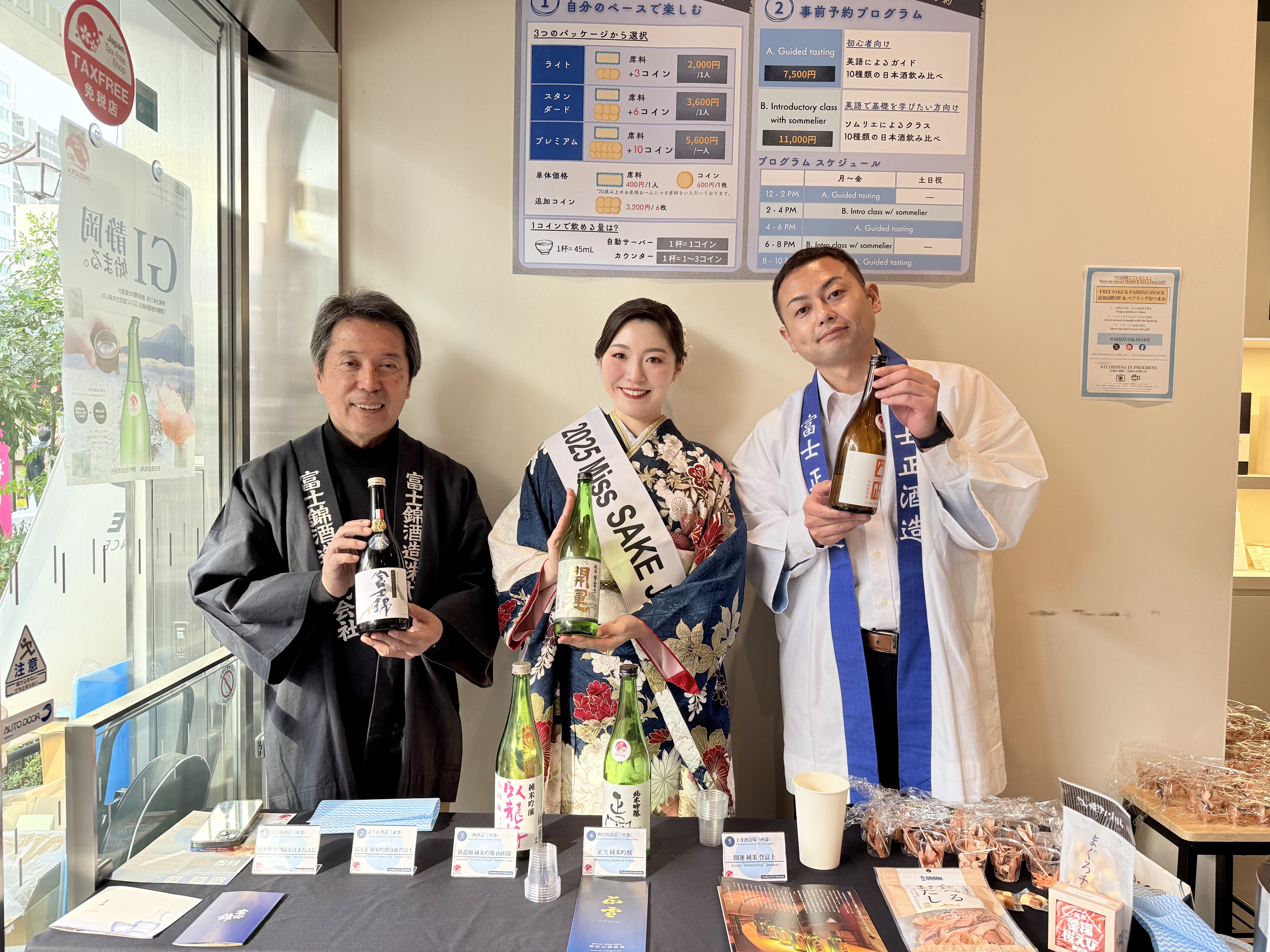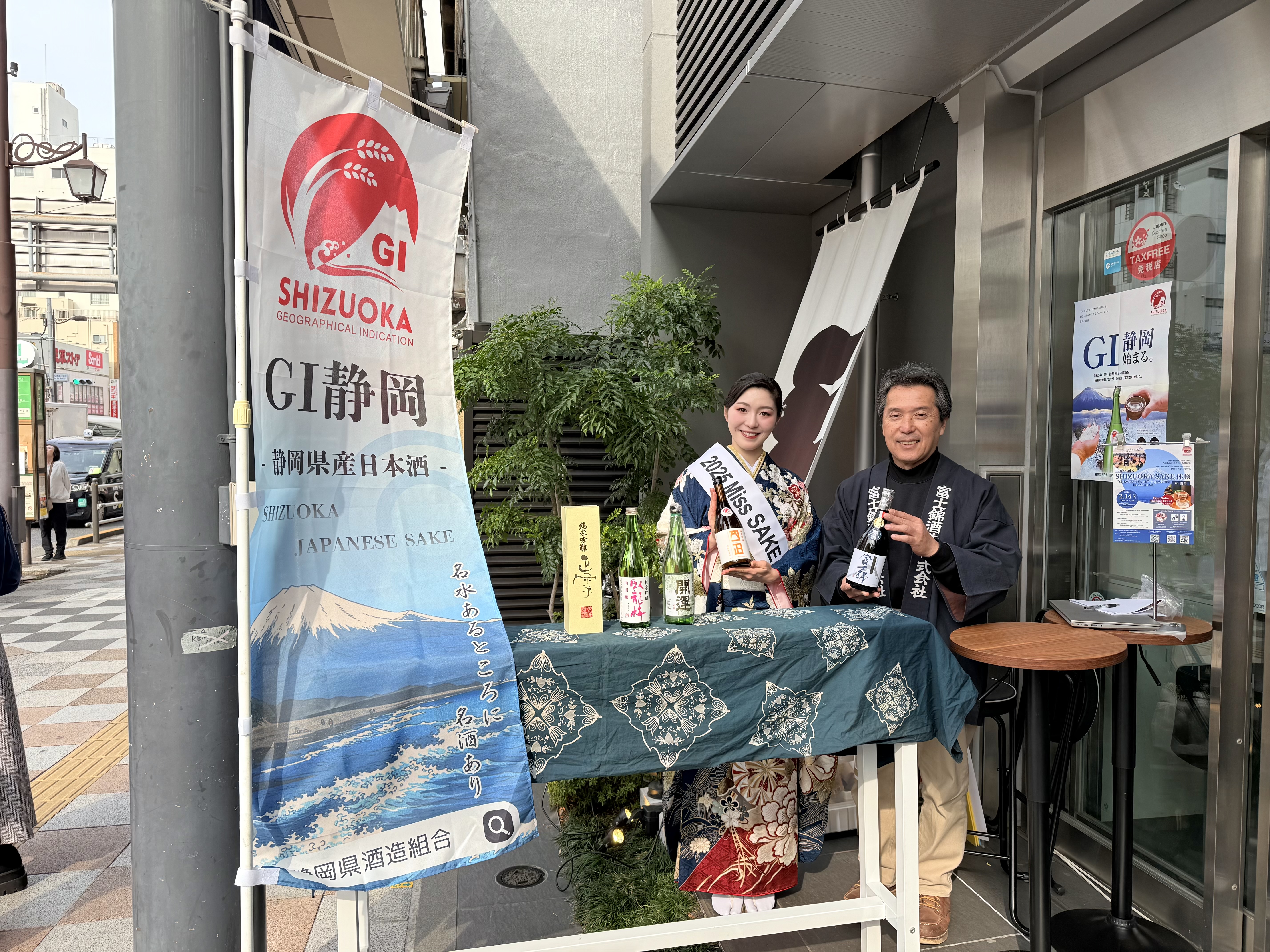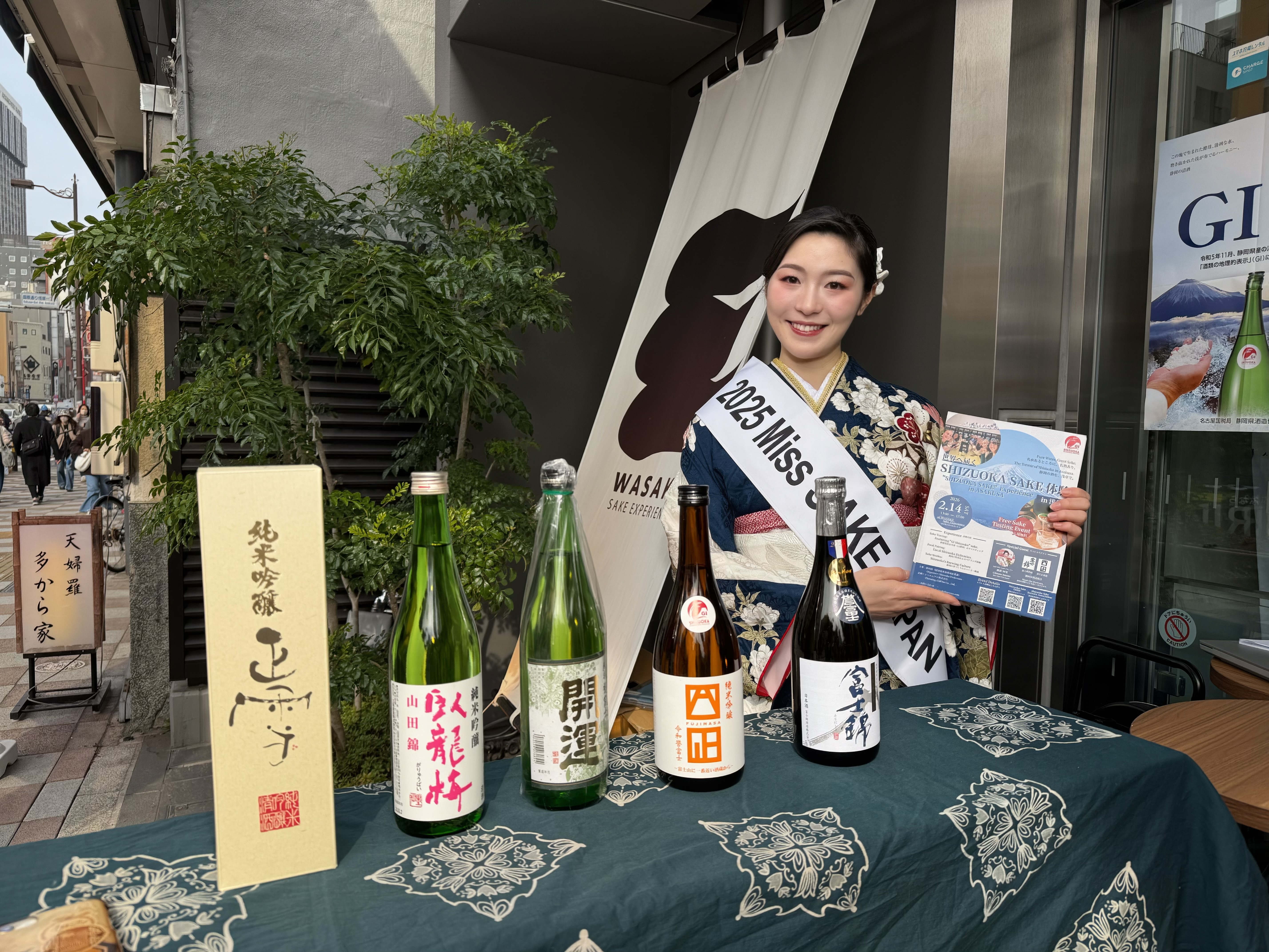 本イベントは、東京・浅草 にある日本酒体験施設 WASAKE Sake Experience で開催された、静岡県産日本酒「GI静岡」の魅力を五感で体感できる一日限定のポップアップイベントです。会場では、GI静岡認定酒の1杯無料テイスティングをはじめ、東部・中部・西部の地域別飲み比べ(SNS投稿またはアンケート参加者対象)、静岡独自の酒米「令和誉富士」を使用した銘柄の紹介、さらに静岡の海の幸を使った特産品とのペアリング体験など、静岡のテロワールを同時に味わえるプログラムが展開されました。当日は私と、2022 Miss SAKE 大阪 飯沢もな氏がナビゲーターとして参加し、国内外の来場者の皆さまへ英語解説やペアリング提案を交えながらご案内いたしました。さらに静岡県を代表する酒蔵である富士錦酒造・富士正酒造の皆さまも会場に立ち、造り手ご自身の言葉で酒造りへの想いや地域性を直接伝えてくださいました。Miss SAKEによる浅草の街での練り歩きも行われ、東京観光の中心地・浅草から世界へ向けて、「究極の食中酒」とも称されるGI静岡の新たな魅力を発信する貴重な機会となりました。