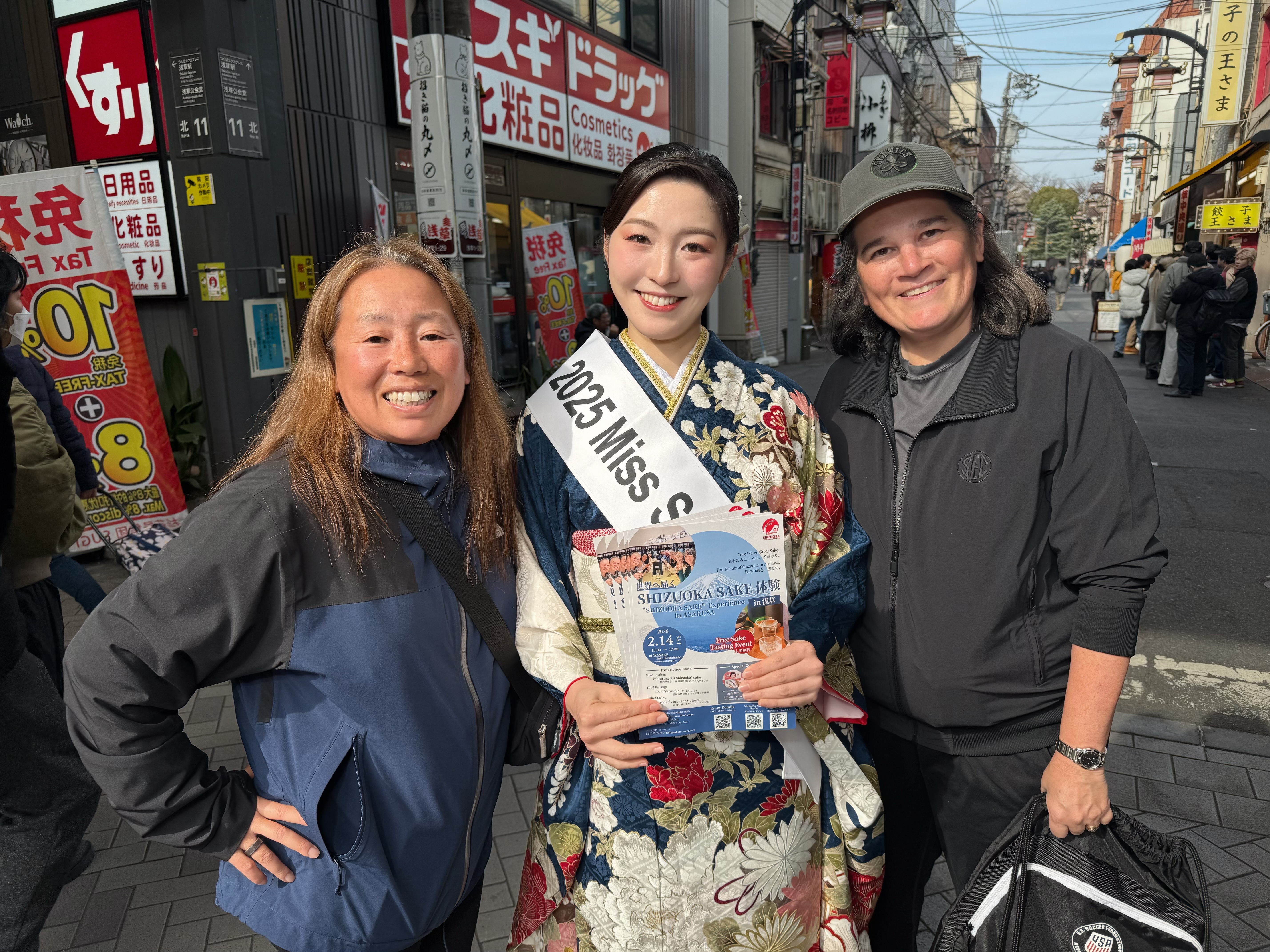 今回はMiss SAKEとして、会場前でのお声がけに加え、浅草市街での練り歩きを通して、多くの方々に本イベントを紹介させていただきました。お着物姿で観光を楽しまれる日本の方々をはじめ、アメリカやカナダ、オーストラリアなど世界各地から浅草を訪れている観光客の皆さまにもお声がけし、GI静岡の日本酒を実際に味わっていただきました。海外のお客様の中には「人生で初めて日本酒を飲む」という方もいらっしゃり、最初は少し緊張された表情だったのが、一口含んだ瞬間に「Delicious!」と笑顔に変わる—そんな場面に立ち会うたび、日本酒が持つ力と、文化を越えて共有できる「UMAMI」への感動を改めて実感しました。日本酒を通じた一期一会の出会いと、その場限りの特別な体験価値を感じられる、私にとってもかけがえのない時間となりました。