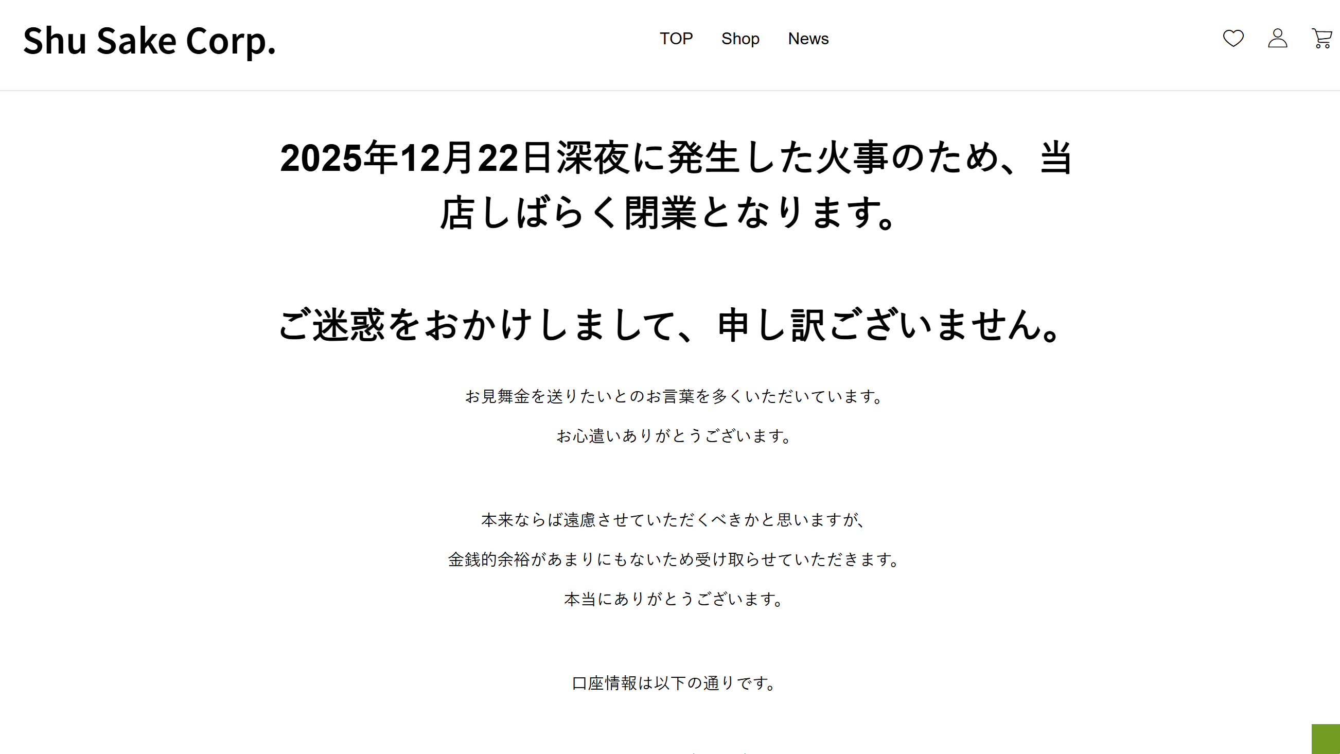 しかしながら、2025年12月22日深夜に発生した火災により、シュウ・サケ・コーポレーション様の店舗は大きな被害を受け、現在、やむを得ずしばらくの間「閉業」という状況となっております。突然の出来事により、営業基盤そのものが失われ、再建に向けては大きな経済的負担を抱えざるを得ない非常に厳しい状況です。現在、シュウ・サケ・コーポレーション様のもとには、「お見舞金を送りたい」「何か力になりたい」といった多くのお声が寄せられているとのことです。再建に向けた厳しい状況を受け、シュウ・サケ・コーポレーション様では、現在もご支援を受け付けておられます。