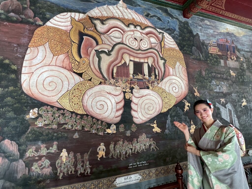 特に印象的だったのは、回廊に描かれた「ラーマキエン」の壁画です。この壁画は、インドの叙事詩「ラーマーヤナ」をもとにタイで再構成された物語で、猿と魔物(デーモン)が戦う場面が印象的に表現されています。