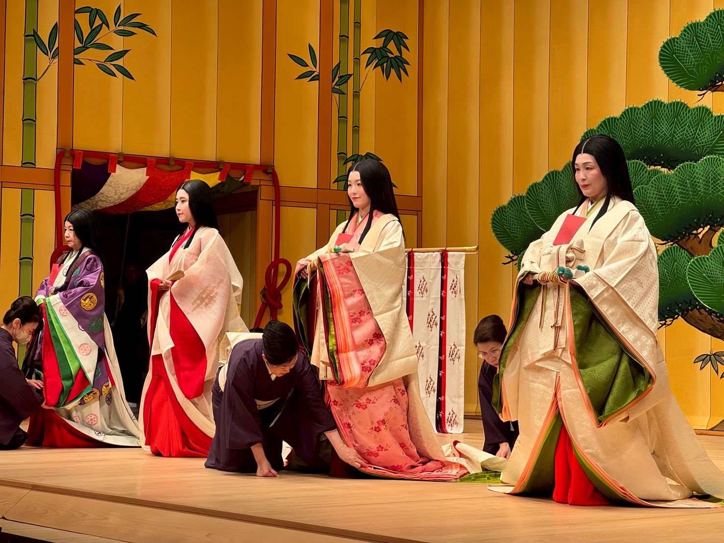 また今回は、ヘアメイクから道具の準備に至るまで、民族衣裳文化普及協会の皆様のお力のもと実現いたしました。関東圏のみならず、名古屋をはじめとする中部圏からもお越しになり、開催の裏側を支えていらっしゃいました。先生方は紫の色無地に、上品な文様の白い帯を合わせた装いで統一されていました。一般財団法人民族衣裳文化普及協会においては、王朝衣裳の専門的な資格を取得した方のみが着装を許されているそうです。約1000年にわたり守り継がれてきた技の重みを、改めて感じる機会となりました。